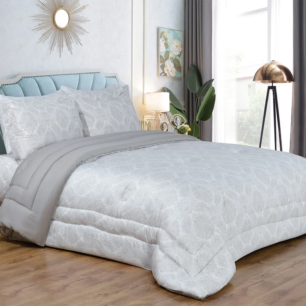 استمتع بالرّاحة المتجدّدة باختيارِك طقم ديباج من القطن المصريّ والسّاتين. يضمن لك هذا الطقم المصنوع من القطن المصريّ ۱۰۰% الرّاحة طوال السّنة، ويحوّل سريرك إلى ملاذ للسّكينة. يُعدّ القطن المصريّ، المعروف بجَوْدته الاستثنائيّة، من بين أفضل أنواع القطن في العالم. وإلى جانب نعومته الفخمة، فإنّ أليافه طّويلة التّيلة تضمن المتانة الدّائمة، حيث إنّها تقاوم التّمزّق والتّكتّل. دلّلْ نفسك واستمتعْ بالأناقة الّتي يقدّمها لك طقم الديباج بيلسو، حيث يتميّز بتصميم راقٍ مظلّلٍ باللّون الرّماديّ ونمط تصميم خالد يضيف لمسة من الفخامة إلى ملاذ نومك.