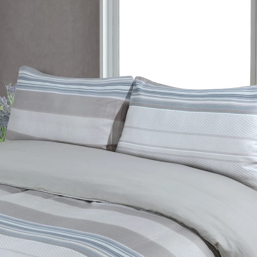 دَلّلْ نفسَك بالرّاحة الفائقة مع سورينتو طقم أغطية مخاد من القطن المصري والساتين. اختر أغطية المخاد سهلة العناية هذه، الّتي تُعدُّ إضافةً مثاليّةً لمجموعة الأسِرَّة الخاصة بك. يُعدّ القطن المصريّ، المعروف بجَوْدته الاستثنائيّة، من بين أفضل أنواع القطن في العالم. وإلى جانب نعومته الفخمة، فإنّ أليافه طّويلة التّيلة تضمن المتانة الدّائمة، حيث إنّها تقاوم التّمزّق والتّكتّل. يمزج هذا التصميم بشكل متناغم بين الألوان الهادئة بشكلِ خطوط أفقية. يرسم هذا التّصميم لوحةَ ألوان مريحة وهادئة تذكّرنا بالسّكينة والصّفاء اللّذَين نجدهما في سماء الصّيف.